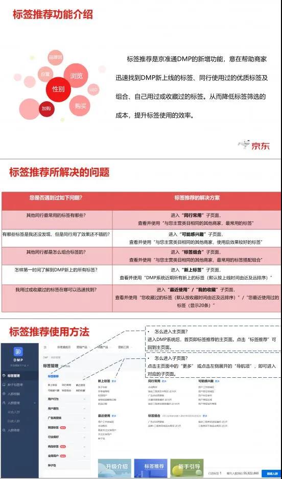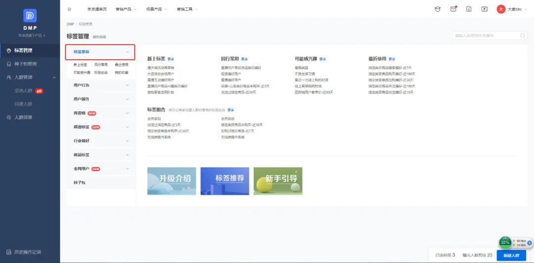 標簽推薦是京準通DMP的新增功能,意在幫助商家迅速找到DMP新上線的標簽、同行使用過的優質標簽及組合、自己用過或收藏過的標簽。從而降低標簽篩選的成本,提升標簽使用的效率。