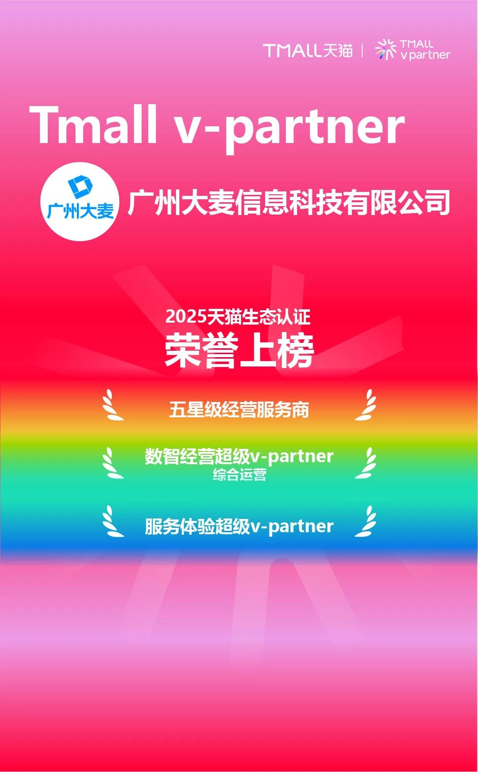 廣州大麥蟬聯天貓五星經營服務商,榮獲數智經營能力認證、服務體驗認證多項殊榮!