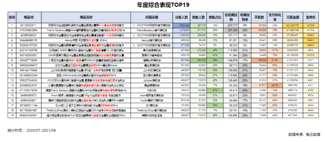 從沐浴露商品綜合表現來看,銷售額TOP1商品來自歐舒丹,近一年交易金額2132W+,同時訪客數和客單價也是最高的,客單價約317元。且在年度表現較好的top5商品中,歐舒丹就占了3個,以補水保濕為主,可見歐舒丹的產品得到消費者認可度較高。