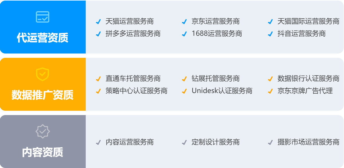 合作保障 合作保障阿里、京東等平臺官方認證星級服務商,擁有完善的質量管理體系,讓服務流程標準化、規范